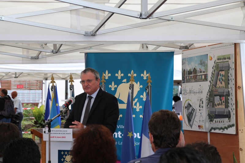 "C’est pour moi une très grande satisfaction d’être là ce matin car ce n’est pas tous les jours que nous posons la 1ère pierre d’une école. Saint-Louis a été la 1ère commune à installer sa commission scolaire, elle a aussi inauguré une nouvelle classe passerelle cette année. Vous nous prouvez là encore que vous êtes comme nous,