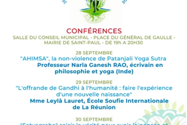 En présence des élu(e)s de la ville dont Suzelle Boucher, Jacqueline Carpin et Alexis Poïnin Coulin la ville de Saint-Paul a démarré ce mercredi 28 septembre la première conférence des Journées Internationales de la non-violence, dans la salle du conseil municipal de Saint-Paul. Animée par le professeur et écrivain en philosophie et en yoga Naral Ganesh RAO, ce premier rendez-vous abordait les thèmes de la relaxation et du yoga. D’autres conférences sont programmées le jeudi 29 et vendredi 30 septembre. L’entrée est libre et gratuite dans la salle du Conseil Municipal de la Ville de Saint-Paul. Nous publions ci-dessous le communiqué de presse de la ville de Saint-Paul. (Photo : Ville de Saint-Paul).