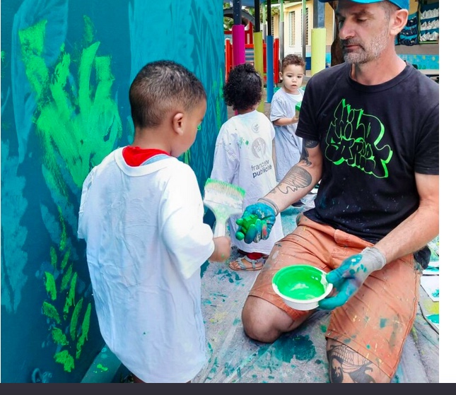 L’artiste surnommé Gorg’One qui a été accueilli au jardin d’enfants Les Combavas auprès des marmailles de la Ville de Saint-Paul. Il a proposé aux enfants aux enfants de re décorer le mur de leur école. Nous publions ci-dessous le communiqué de presse de la ville de Saint-Paul. (photo : ville de Saint-Paul)