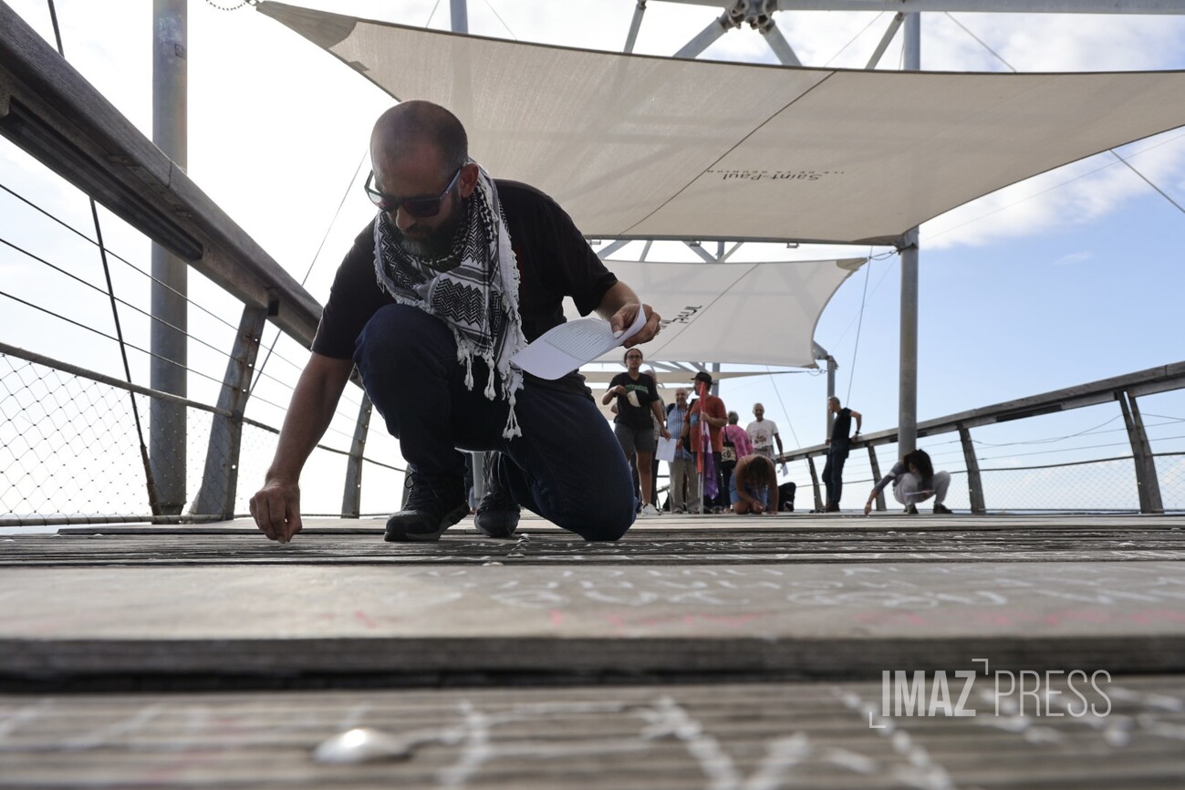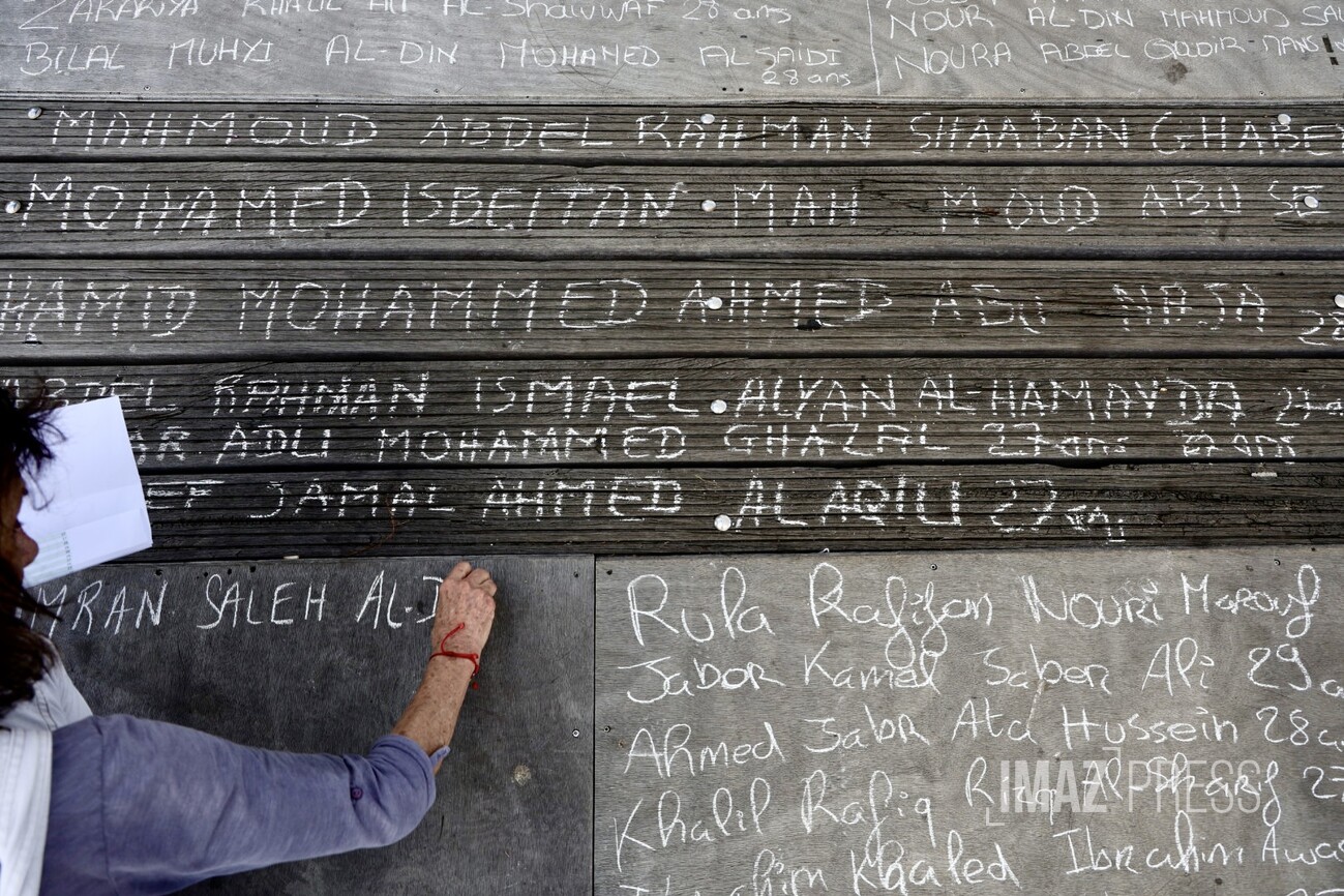 En hommage aux victimes, estimées à 52.829 personnes d'après un dernier bilan, leur nom ont été inscrits à la craie sur les lattes du débarcadère.