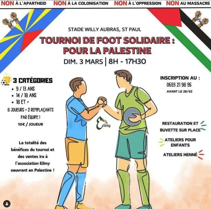 Apporter son soutien à un pays en guerre tout en faisant du sport n'est pas mission impossible ! En effet ce dimanche 3 mars 2024 au stade William Aubras de Saint-Paul, un tournoi de football est organisé dont tous les bénéfices seront reversés à l'association Eilmy oeuvrant en Palestine.
