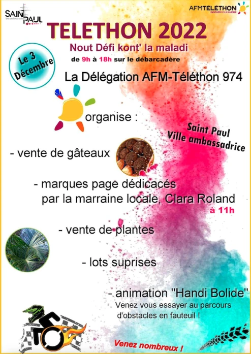 Ce samedi 3 décembre, de 9h à 18h sur la place du débarcadère, venez participer aux animations proposées par la Délégation AFM-Téléthon 974. La Ville de Saint-Paul, labellisée Ville active et sportive s’engage auprès des militants, des malades et parents de malades, concernés par des maladies génétiques, rares, évolutives et lourdement invalidantes, les maladies neuro-musculaires.