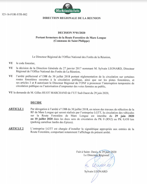 L'Office national des forêts (ONF) informe le public, par un arrêté préfectoral, de la fermeture dans les deux sens de circulation de la Route Forestière de Mare Longue pour la réalisation de travaux de réfection du 29 juin 2020 au 10 juillet inclus. Nous publions ci dessous l'arrêté