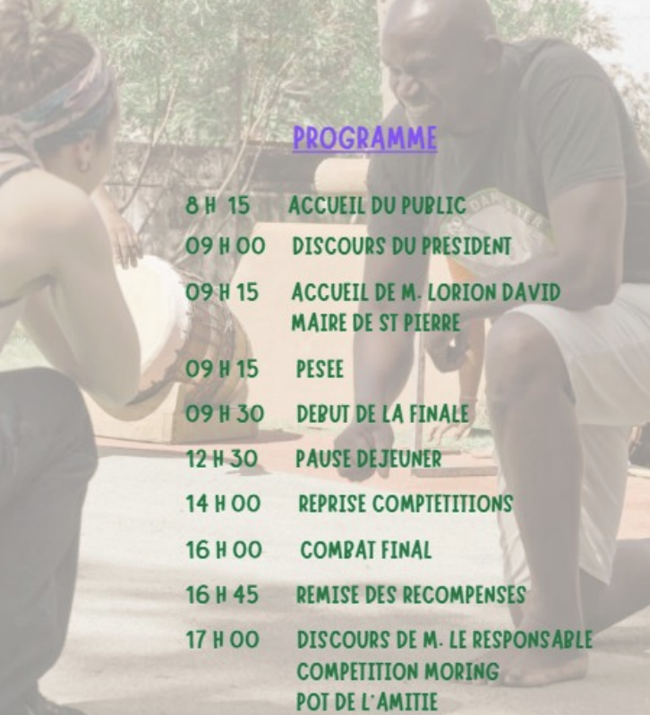 Tout au long de la journée, les meilleurs pratiquants de moringue de toute La Réunion s’affronteront dans des combats spectaculaires, rythmés par les percussions et l’ambiance festive propre à cette discipline héritée des cultures africaines et malgaches.