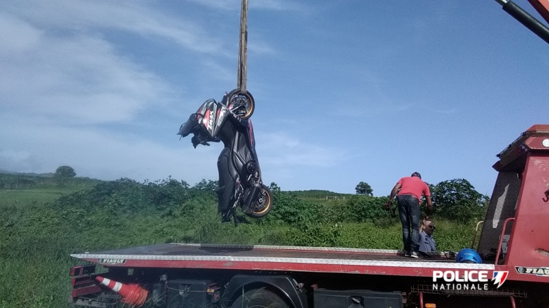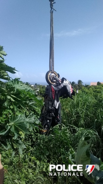 Ce jeudi 31 mars 2022, à Saint Pierre, ligne Paradis, un scootériste et son passager ont terminé leur course dans une ravine après avoir refuser de se soumettre à un contrôle policier. Une grue a été nécessaire pour retirer le gros cube du lit de pierres sur lequel il avait atterri. Le scooter bien que n'appartenant pas au conducteur a été confisqué et mis en fourrière aux frais du propriétaire. Nous publions le communiqué complet ci-dessous (Photo Police nationale)