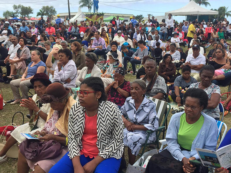 • 13h45 - La foule continue d'affluer. Michel Vergoz, maire de Sainte-Rose, se place juste devant l'autel installé sur une estrade. Beaucoup de personnes âgées composent la foule. Les bénévoles, coiffés de casquettes bleués, orientent les retardataires dans les îlots. Peu de places sont encore vides.