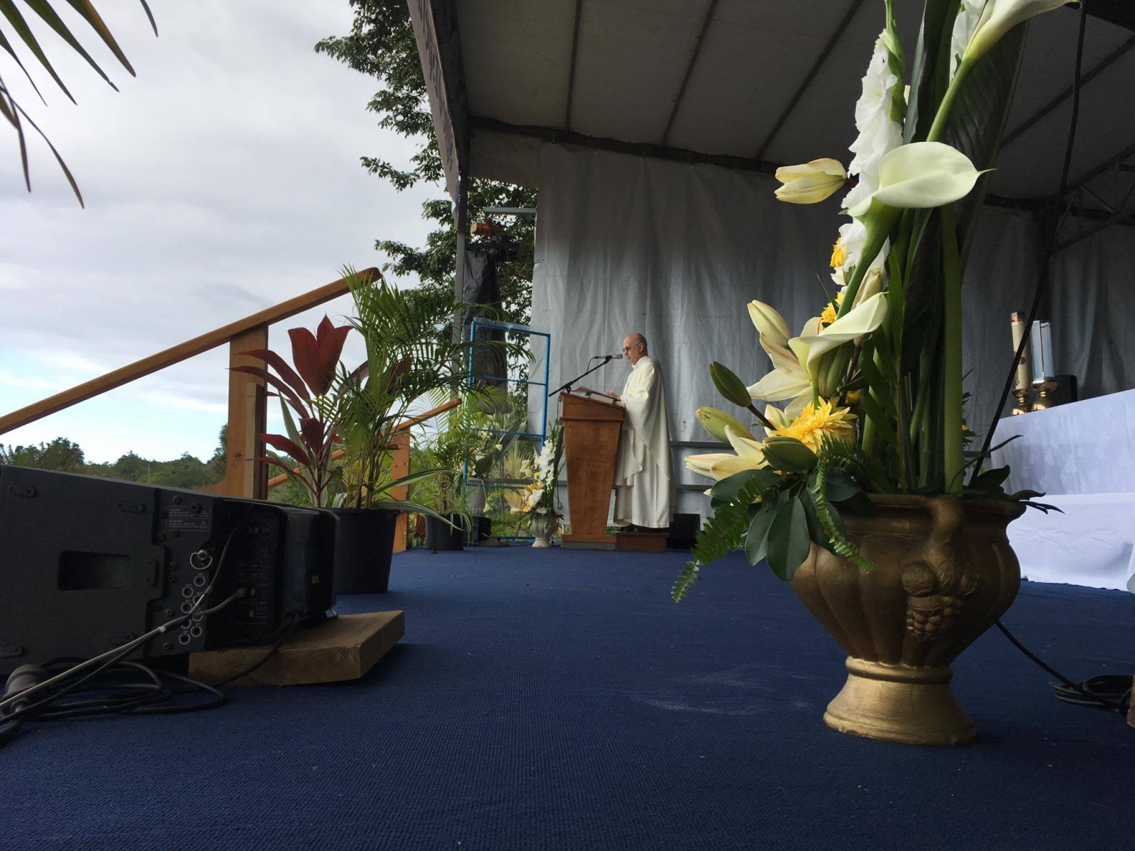 • 15h24 - Les fidèles apportent différents objets pour qu'ils soient bénis par l'évêque : barque et tableau représentant un récif corallien, pain et vin, roche volcanique et panneau représentant le volcan...