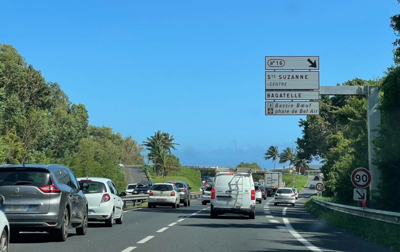On roulait difficilement sur la quatre voies de Sainte-Suzanne ce vendredi 18 février 2022 au matin, suite à un accident impliquant trois véhicules dans la descente de la Mare. Celui-ci s'est terminé à 9h20 ce matin, mais il a neutralisé pendant un moment la voie de gauche. Les embouteillages se sont résorbés, la circulation est à nouveau fluide en direction de Saint-Denis. Suite à l'accident, une femme, en état de choc, a été emmenée à l'hôpital par les secours mais aucun blessé n'est à signaler. (Photo vs/www.ipreunion.com)
