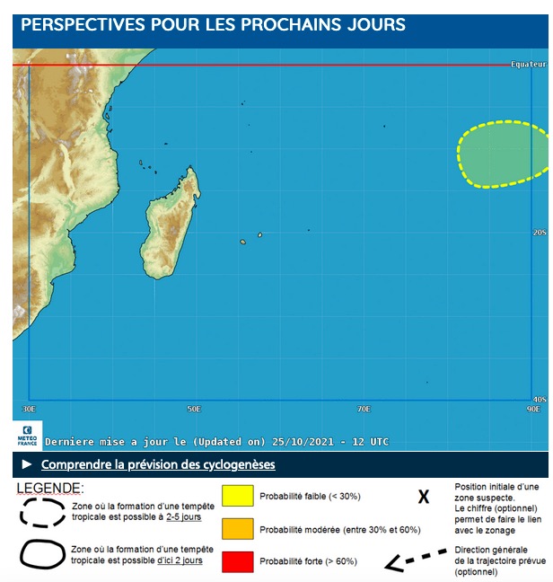 La première tempête de la saison cyclonique pourrait-elle bientôt se former ? Selon Météo France Réunion, une zone suspecte est présente dans l'est du bassin de l'Océan Indien. Elle représente un risque de formation d'une tempête tropicale modérée pour les cinq prochains jours, soit samedi. La zone surveillée se trouve cependant très loin de La Réunion. Certains modèles suggèrent la formation d'un système dépressionnaire tropical de faible intensité, qui "profitera d'abord de conditions environnementales propices à la consolidation de la circulation (...) avant d'être gêné par un cisaillement de vent grandissant et à la présence d'air sec" précise Météo France. (Photo Mtotec)