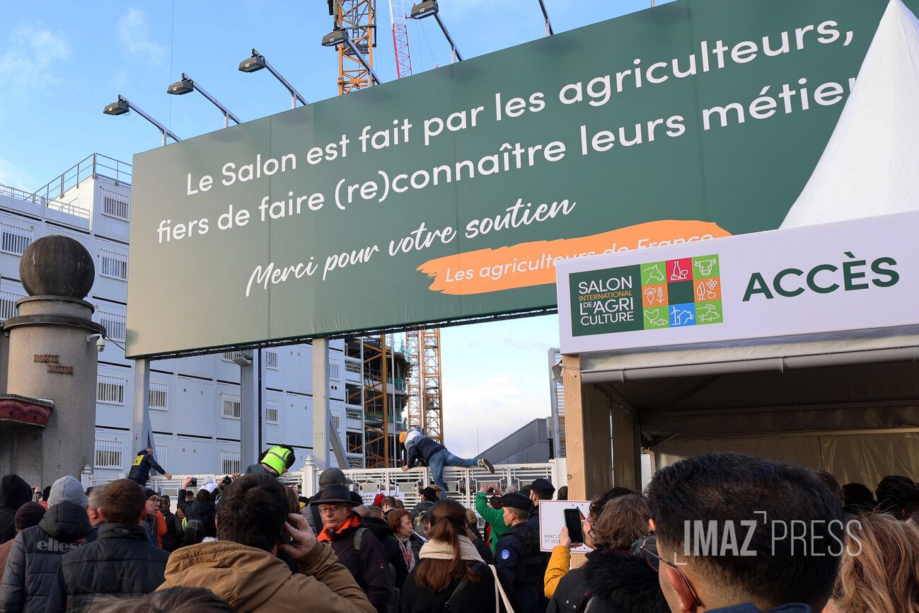 Les portes du palais des expositions ne s'ouvrent pas. Sans que l'on sache vraiment pourquoi. La grogne des agriculteurs monte d'un cran. Certains d'entre-eux finissent par escalader un portail et le font céder sous la poussée.
