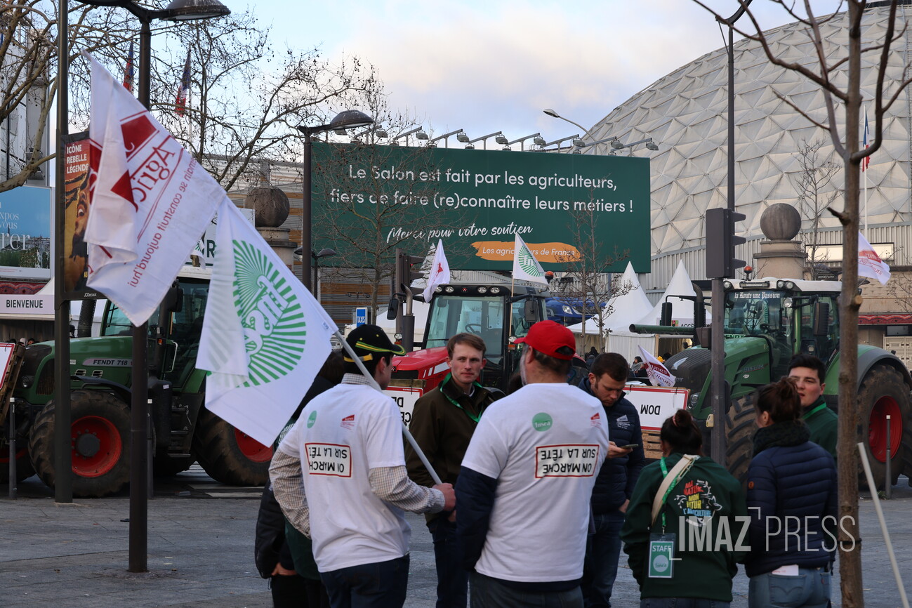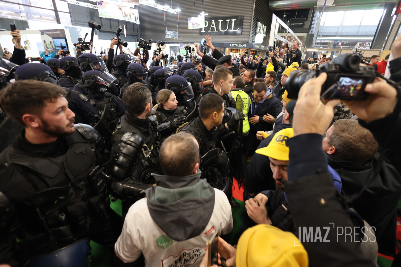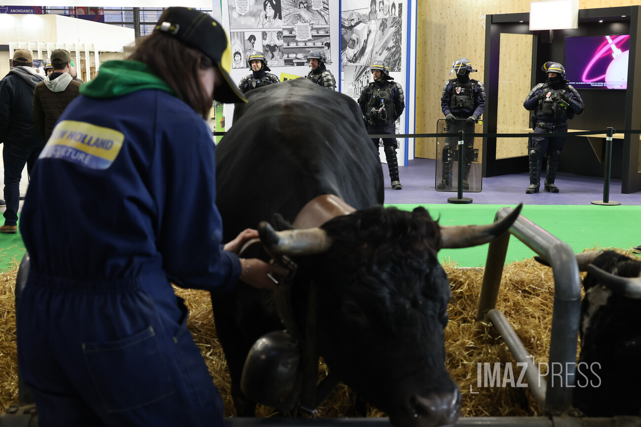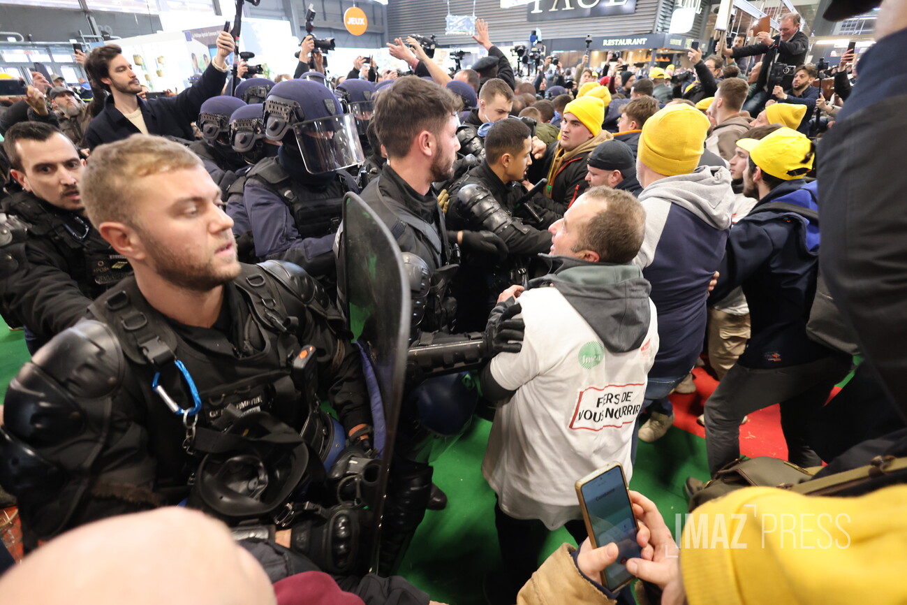 Dans les allées du Salon, les forces de l'ordre sont partout, du jamais vu. Trois personnes ont été interpellées pour des violences sur personne dépositaire de l'autorité publique, selon le parquet de Paris, puis relâchées; elles seront convoquées ultérieurement.