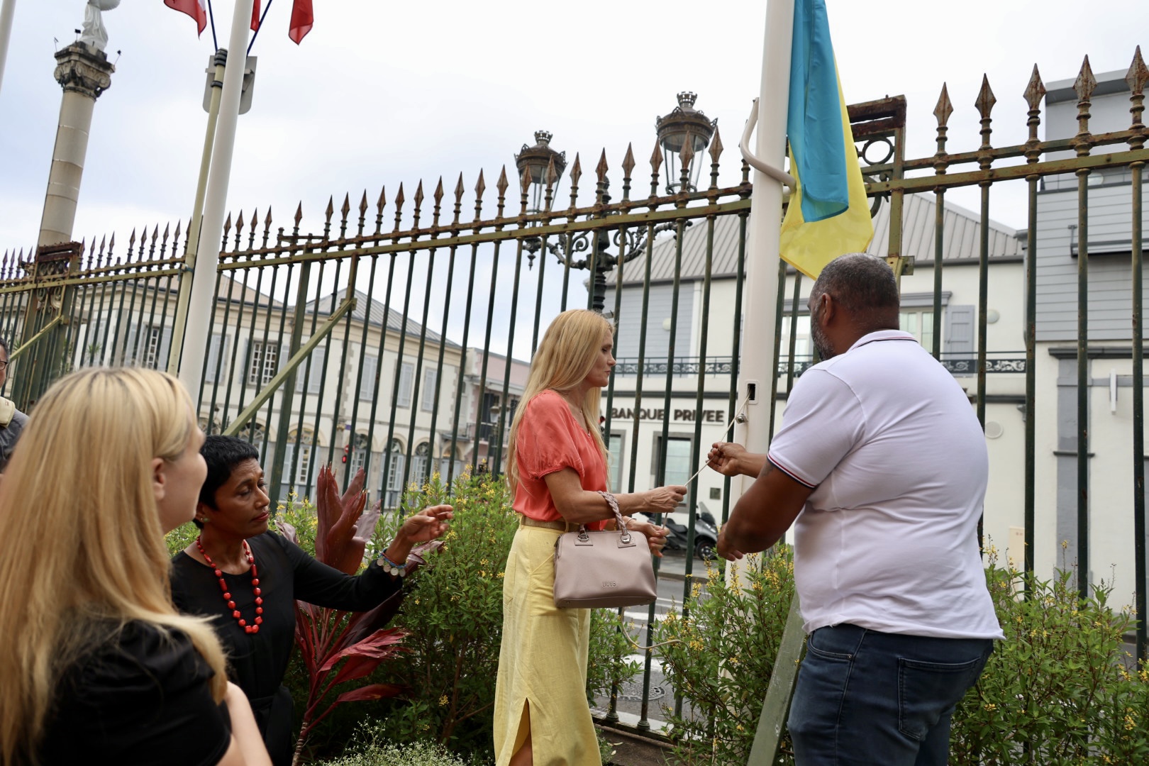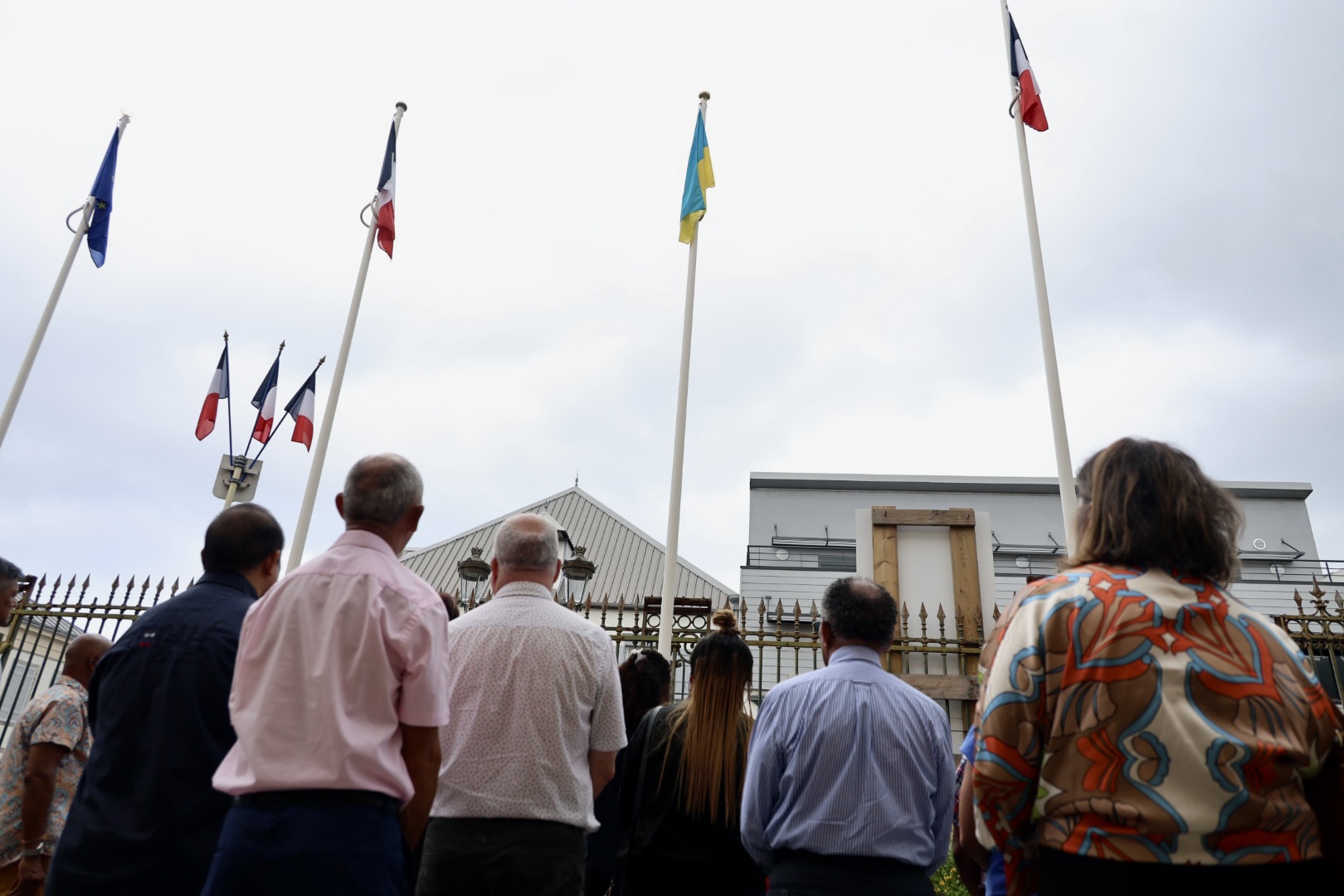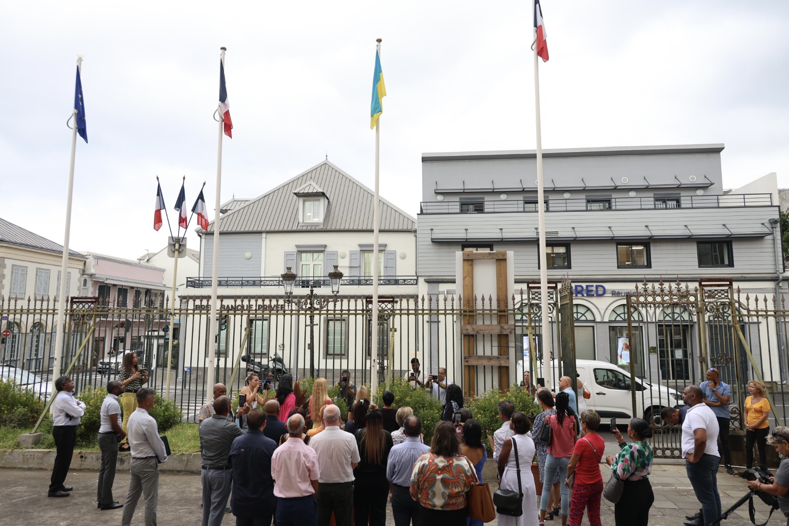 La ville de Saint-Denis, représentée par Ericka Bareigts la maire, a souhaité afficher son soutien au peuple ukrainien en hissant son drapeau à l'ancien hôtel de ville. Après un échange avec des réfugiés ukrainiens, l'hymne du pays a raisonné dans le coeur de la ville de Saint-Denis. La date du 24 février est hautement symbolique : elle correspond, au jour près, au début de l'invasion russe de l'Ukraine il y a un an. (photos : sly/www.imazpress.com)