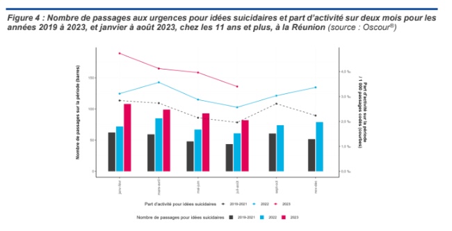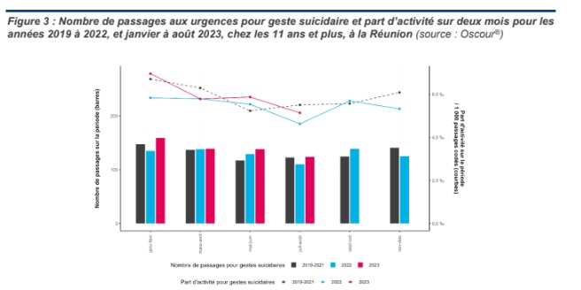 À la Réunion, l’activité des urgences en lien avec le geste suicidaire reste relativement stable dans le temps. On rapporte environ 130 passages pour une période de 2 mois et une part d’activité de 5/1000 passages. Au début 2023, période janvier-février, le nombre de passages (n=159) et la part d’activité (7/1000 passages) pour geste suicidaire aux urgences étaient cependant plus élevés, pour ensuite rejoindre les niveaux des années précédentes.