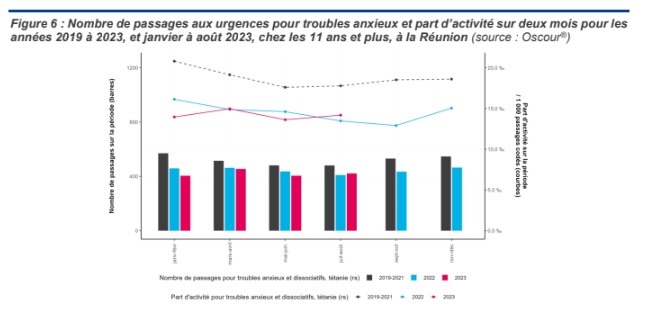 À la Réunion, le nombre de passages aux urgences pour troubles anxieux et la part d’activité sont relativement stables au cours de l’année. On observe cependant que depuis 2022, le nombre de passages (n=422 pour 2 mois en 2023 vs 521 pour 2 mois en 2019-2021) et la part d’activité (14.2/1000 passages en 2023 vs 18.7/1000 passages en 2019-2021) sont plus bas que lors de la période 2019-2021.