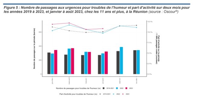 À la Réunion, le nombre de passages aux urgences pour troubles de l’humeur est relativement stable au cours du temps (environ 300 passages pour 2 mois), tout comme la part d’activité (11/1000 passages). On observe cependant que le nombre de passages et la part d’activité pour troubles de l’humeur est plus élevée en 2023 que lors de la période 2019-2021.