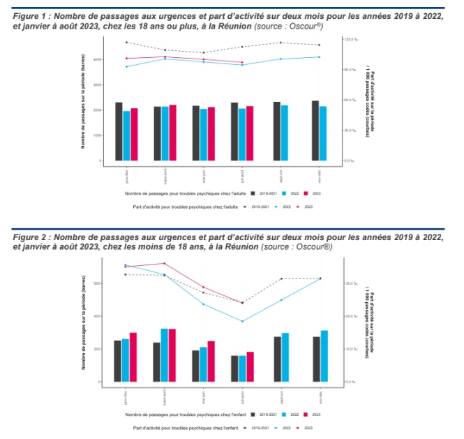 Chez l’adulte. En 2023, le nombre de passages aux urgences pour troubles psychiques reste globalement stable, autour de 2000 passages pour 2 mois. La part d’activité des urgences pour troubles psychiques varie peu également (autour de 100/1000 passages). L’activité est globalement légèrement plus basse en 2023 que sur la période 2019-2021.