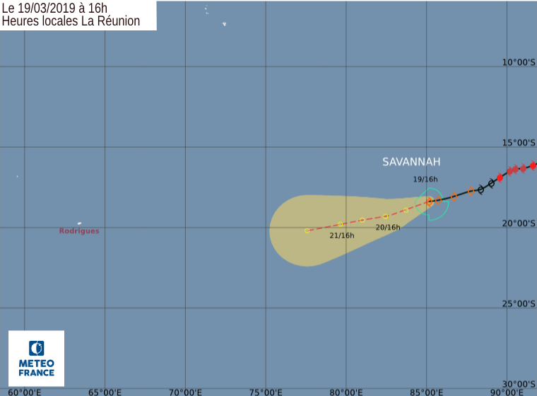 Position le 19 mars à 16 heures locales Réunion: 18.4 Sud / 85.2 Est.