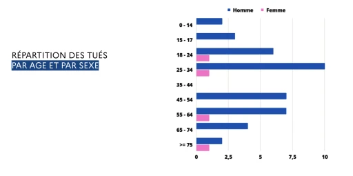 La majorité des victimes sont des hommes âgés de 25 à 34 ans.