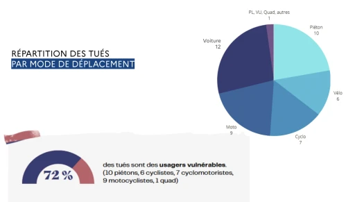 Parmi les victimes qui ont perdu la vie, la majorité était en voiture ou en deux-roues. 12 personnes qui sont décédées étaient des automobilistes et 9 étaient des pilotes de deux-roues. Les piétons aussi paient un lourd tribut avec 10 personnes décédées en 2022.