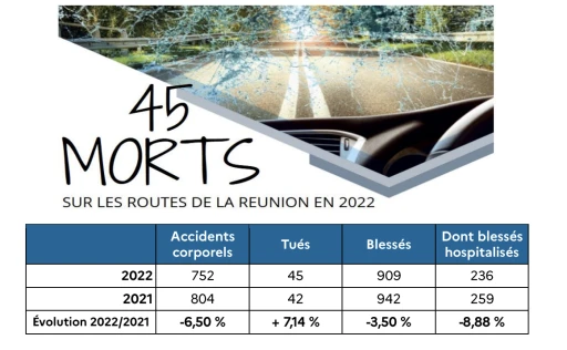 Dans ce rapport, on peut voir que 752 personnes ont été victimes d'accidents corporels en 2022 sur les routes de La Réunion. 45 personnes sont décédées et 909 blessées dont 236 hospitalisées.