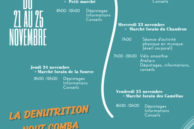 Site Nord : « La caravane de la dénutrition » du 21 au 25 novembre : Avec le soutien de la ville de Saint-Denis et de l’ARS de la Réunion, l’équipe de l’UTNC nord et leurs partenaires (dentiste, orthophoniste, éducateur activité physique adaptée) se rendra au contact de la population pour communiquer sur la problématique de la dénutrition. Des animations et ateliers (ateliers diététiques, prévention de l’état bucco-dentaire, trouble de la déglutition, dépistage de la dénutrition, séance d’activité physique adaptée, quizz sur les idées reçues) auront lieu du lundi 21 au vendredi 25 novembre dans des quartiers différents de Saint-Denis: parvis du CHU Nord (lundi), petit marché (mardi), marché du Chaudron (mercredi), marché de la source (jeudi) et marché des camélias (vendredi).