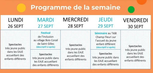 À destination des familles de tout-petits en situation de handicap et des professionnels qui les accompagnent, la semaine s’organise autour de temps forts :