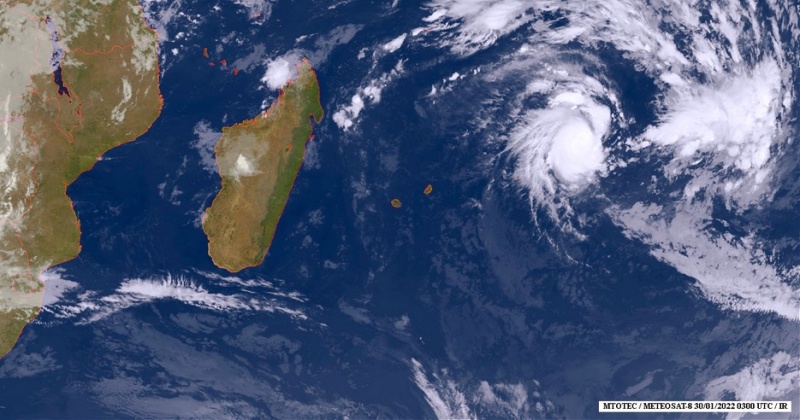 La Réunion est en pré-alerte cyclonique depuis 18h. Le deuxième système de la saison, baptisé Batsirai, s'est rapidement renforcé pour atteindre le stade de cyclone "dangereux", ce dimanche 30 janvier 2022. Celui-ci en cette fin de journée est à 1.100 km de nos côtes. Et il pourrait atteindre le stade de cyclone intense le lundi 31 janvier 2022. Le système devrait représenter une menace pour les prochaines 72h, indique la Préfecture. (Photo : Mtotec)