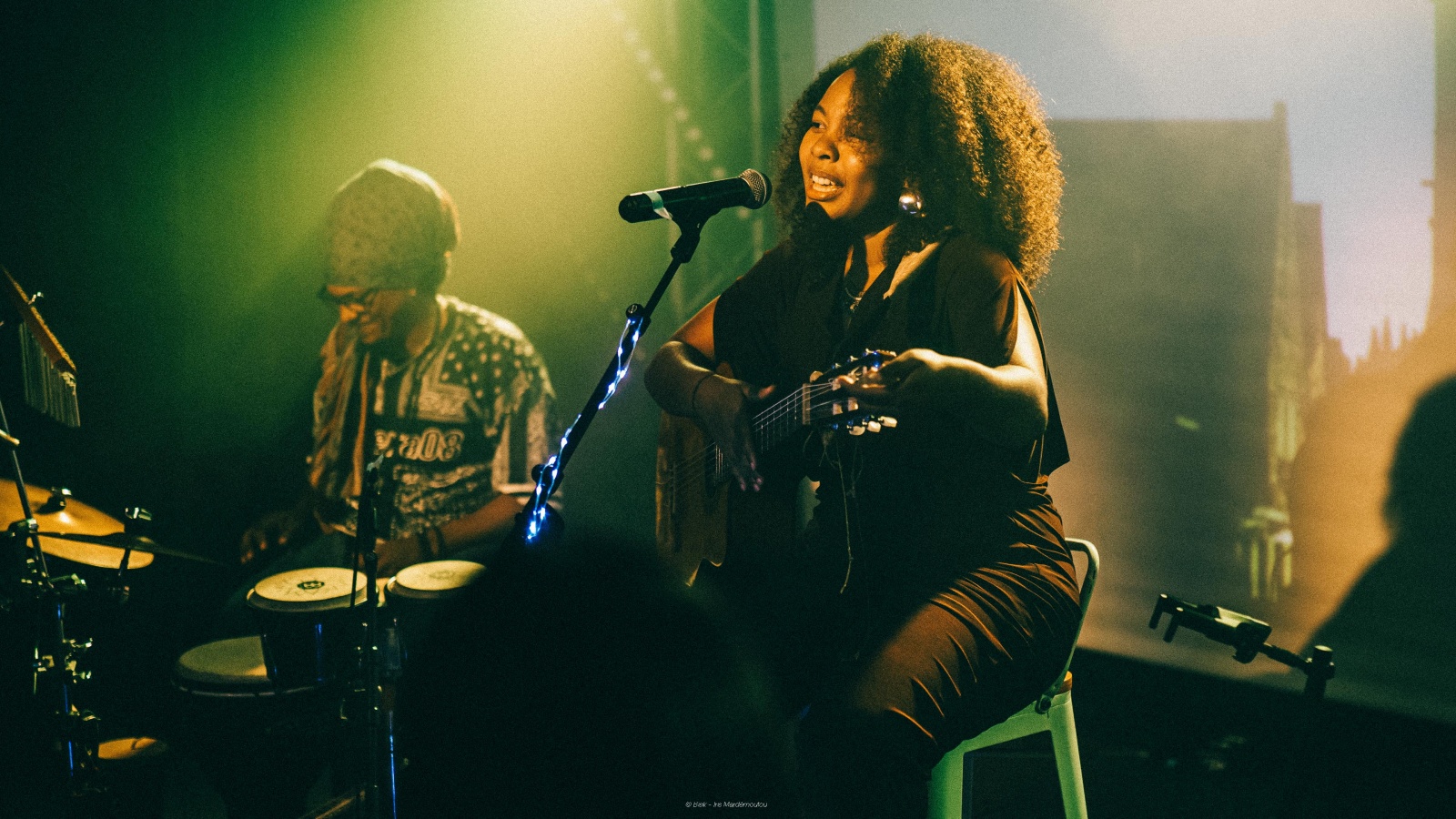 La soirée atteint son apogée avec le concert tant attendu de Léa Noël. Léa déploie une énergie magnétique, avec une présence et un charisme incandescent grâce à sa personnalité flamboyante et son sourire communicatif. Elle est accompagnée de Hubert Marcelin, multi-instrumentiste de haut vol, qui maîtrise toute une panoplie de percussions à la fois. On ne sait plus où tourner le regard tellement le talent est éblouissant. Entre douceur et intensité, le public est chahuté par les vagues d’émotions, les yeux parfois embués.
