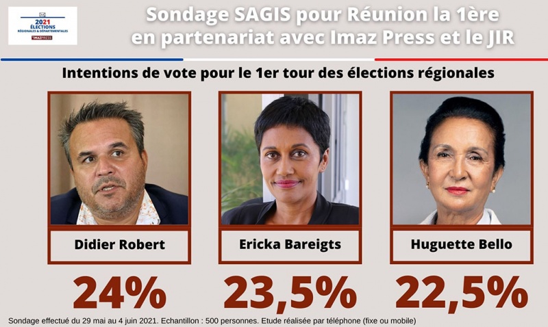 24%, ce sont les intentions de vote en faveur du candidat Didier Robert au 1er tour des régionales du 20 juin 2021, selon un sondage Sagis pour Réunion la 1ère en partenariat avec Imaz Press et le JIR réalisé entre le 29 mai et le 4 juin 2021. Il est talonné par Ericka Bareigts avec 23,5% des intentions de vote et Huguette Bello avec 22,5% des intentions de vote. Vanessa Miranville, Patrick Lebreton et Olivier Hoarau, respectivement à 8,5%, 8% et 7% des intentions de vote, pourraient être les arbitres d'un second tour qui positionne la gauche en ballotage très favorable face à un Didier Robert, seul candidat à droite, qui semble bien mal embarqué à moins de deux semaines du 1er tour. Comme tout sondage, il convient bien évidemment de les regarder avec prudence compte tenu des marges d'erreurs. Il donne surtout à voir une indication significative de l'état du rapport des forces entre les listes. Néanmoins, rien n'est joué. Les résultats définitifs dépendront de la capacité des candidats et leurs soutiens à mobiliser leur électorat durant ces deux semaines pour accroître ou consolider leur score
