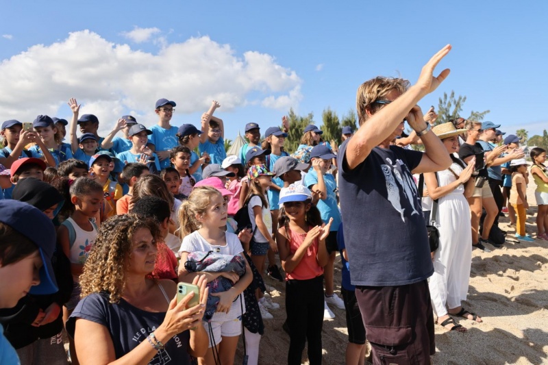 Speedy, une jeune tortue verte, a retrouvé l'océan ce mardi matin 7 juin 2022. Accompagnée par les élèves de deux écoles, elle a été remise à l'eau au niveau de la plage des Brisants. Après avoir été victime d'un choc violent - vraisemblablement avec un bateau, en novembre 2021, Speedy a dû subir une opération chirurgicale lourde et son état a nécessité plusieurs mois de soins à Kelonia, le centre de recherches et d'observation des tortues, à Saint-Leu (Photo rb/www.ipreunion.com)