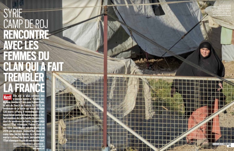Le journal Paris Match publie un long reportage effectué dans les camps kurdes dans lesquelles se trouvent 800 familles de Daech. Sur place, les journalistes ont pu échanger avec les veuves des frères Fabien et Jean-Michel Clain, Réunionnais radicalisés ayant revendiqué les attentats de 2015 à Paris, avant d'être abattus en 2019. Les deux femmes parlent à demi-mot de leur vécu dans le camp et des souvenirs de leurs ex-maris, tout en restant adeptes des idéologies de l'Etat islamique. (Photo : Frédéric Lafargue /Capture d'écran Paris Match)