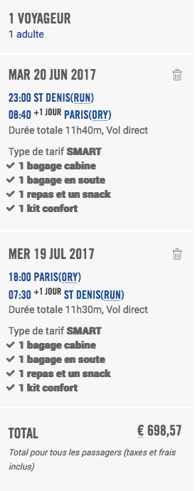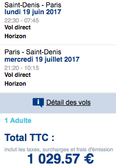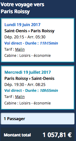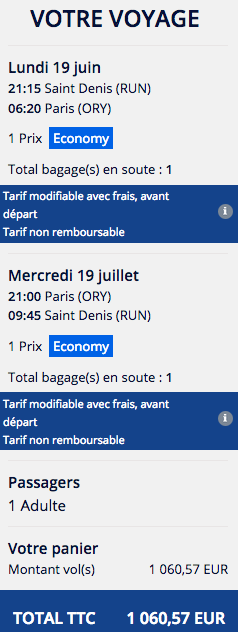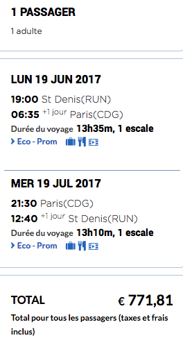 Ainsi, pour un aller-retour Réunion/Paris, départ le 19 juin 2017 et retour le 19 juillet 2017, c'est bien French Blue qui est la moins chère. Même si ce comparatif donne une idée des tarifs à un temps T, et ne tient pas compte d'éventuelles promotions, il permet d'obtenir un classement, du plus cher au moins cher. Dans l'ordre, on trouve donc Air France, Air Austral, Corsair, XL Airways et French Blue.