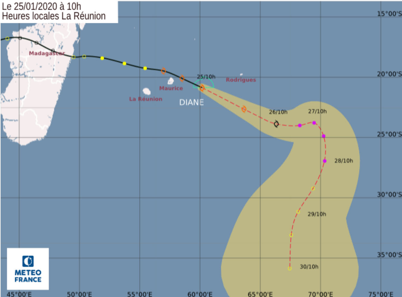 Devenue la tempête tropicale modérée en fin de journée de ce vendredi 24 janvier, Diane se trouvait à 4 heures ce samedi à 305 km à l'est-nord-est des côres réunionnaises. Elle continue de faire route vers l'est-sud-est à la vitesse de 26 km/h.