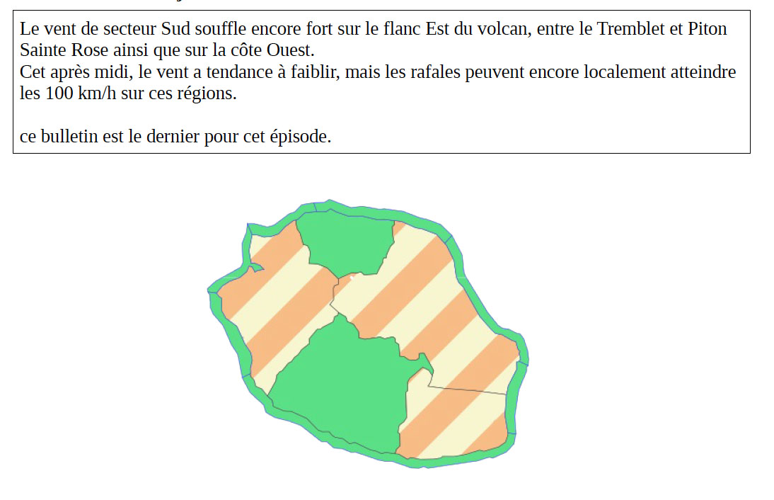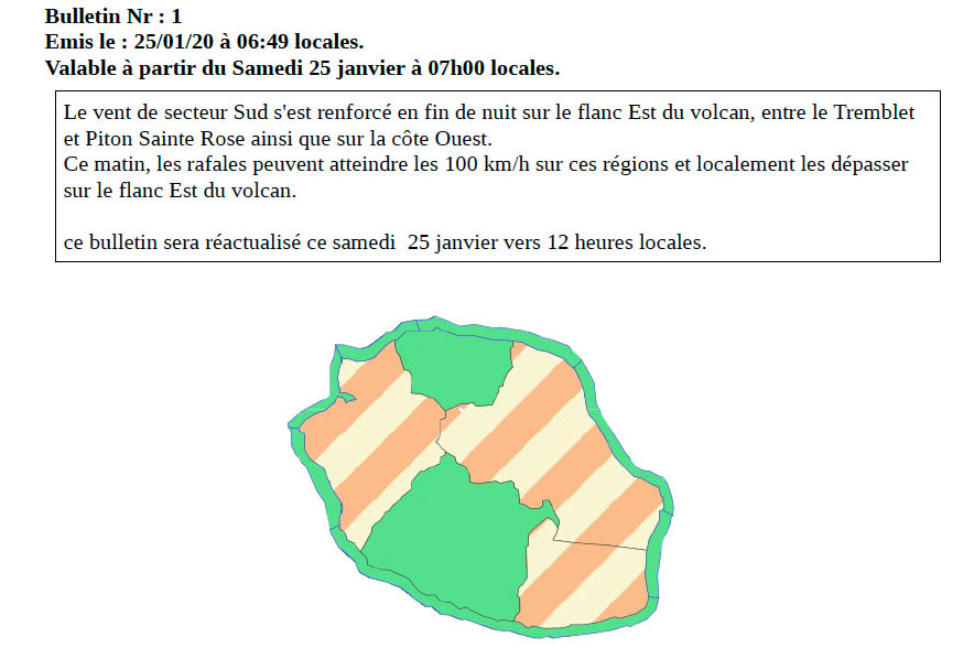 "S'agissant des vents, les conséquences du passage de ce système dépressionnaire seront beaucoup plus limitées.Mais il faut cependant s'attendre à un renforcement des vents en soirée et début de nuit, avec des vents de sud soufflant assez fort dans l'Ouest, sur le flanc est du volcan (secteur de Bois Blanc en particulier), ainsi que sur les Plaines. Des rafales maximales approchant les 100 km/h sont envisagées dans les sites les plus exposés" préviennent les météorologues.