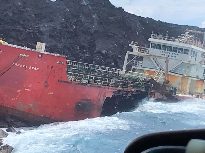 Le survol du Tresta Star par le député Jean-Hugues Ratenon et Attac Réunion a permis de constater que la coque du navire mauricien, échoué lors du passage du cyclone Batsirai, est totalement éventrée. Extinction Rebellion dénonce également l'échec du plan Polmar. Le bateau se trouve toujours au Tremblet. Il doit bénéficier de l'aide du Champlain, appartenant à la Marine française, pour poursuivre les opérations de dépollution alors que l'armateur n'a pas honoré son engagement d'intervenir rapidement (Photos : Jean-Hugues Ratenon / Attac Réunion)