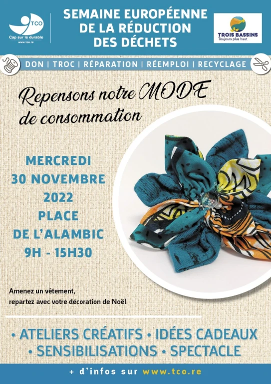 Ce mercredi 30 novembre 2022, à compter de 9 heures, place de l'Alambic, une journée d'animation est organisée dans le cadre de la Semaine européenne de réduction des déchets. Au programme : stand de sensibilisation sur le textile ; exposition d’articles en matériaux de récup' ; ateliers de fabrication de décorations de Noël en tissu, de carte de Noël, de bonhomme de neige, de tapis mendiant ; exposition d’objets 3D réalisés à partir de plastique de récupération, dressing solidaire et spectacle de danse.