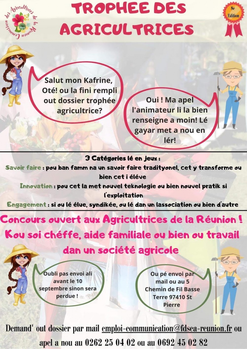 La Commission des agricultrices ouvre ce concours à toutes les agricultrices de l’île de la Réunion. Pour tous renseignements, n'hésitez pas à nous contacter au 0262 25 04 02 ou au 0692 45 02 82 ou au 0692 54 05 58 ou encore par mail à emploi-communication@fdsea-reunion.fr