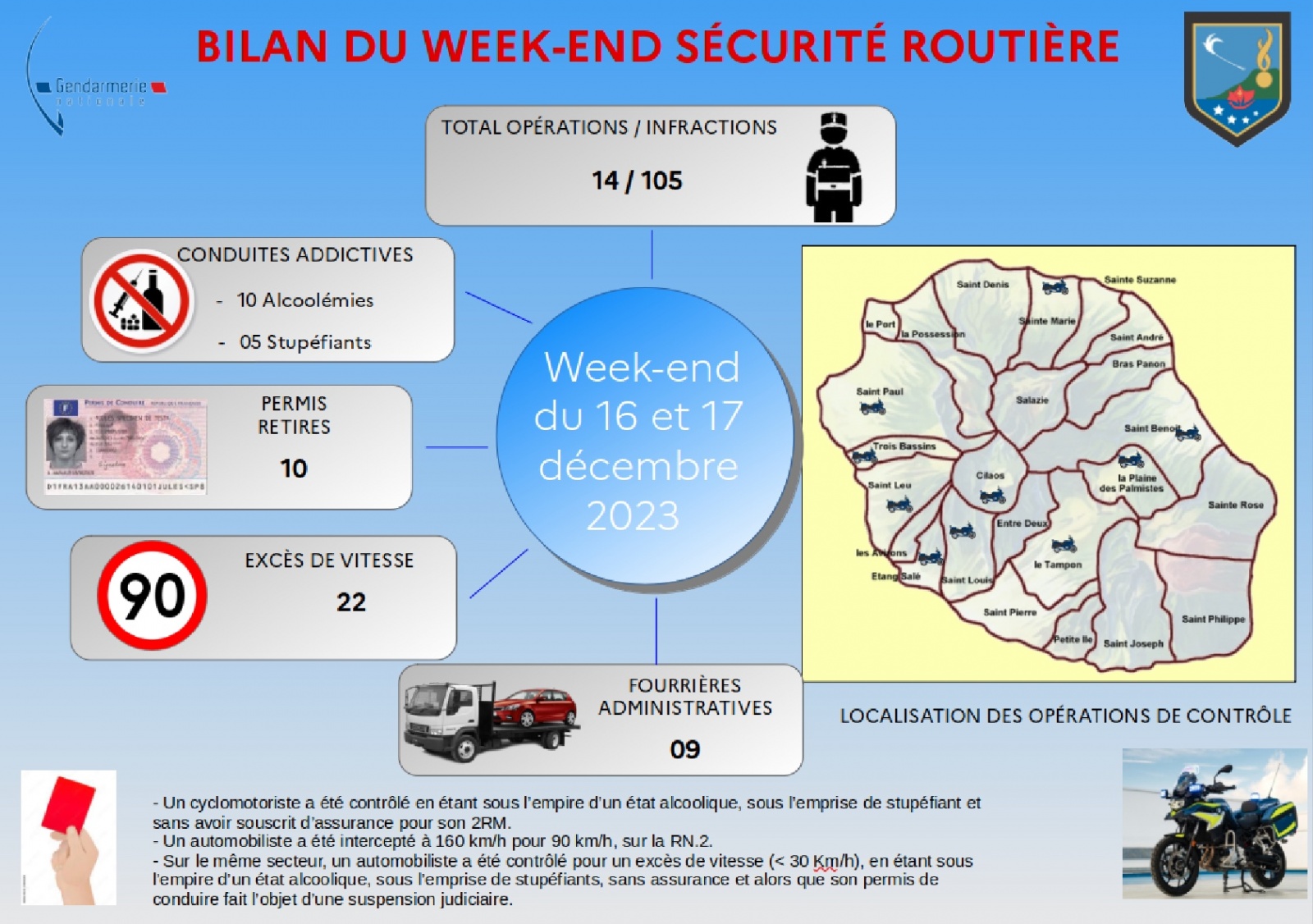 Les effectifs de la Direction Territoriale de Police Nationale de La Réunion ont réalisé sur le département 21 opérations de sécurisation et de sécurité routière au cours de ce week-end du 15 au 17 12 2023 permettant de relever 75 infractions dont 10 délits :