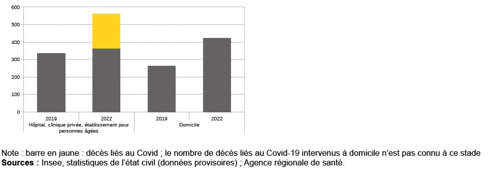 Les décès à domicile représentent quatre décès sur dix. Leur nombre augmente également fortement entre 2019 et 2022 : 423 du 1er janvier au 14 février 2022, soit 161 de plus que trois ans plus tôt. Cette hausse s’explique pour une part par la poursuite du vieillissement de la population : les générations nombreuses du baby-boom des années 1950 arrivent depuis quelques années à des âges plus élevés, où la mortalité est plus forte. Pour l’autre part, il n’est pas possible d’apporter d’éléments explicatifs à ce stade, les causes de décès à domicile n’étant pas encore connues.