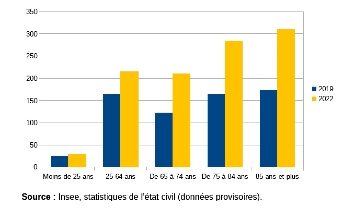 Les décès augmentent le plus fortement pour les 65 ans ou plus (+ 75 %). La surmortalité concerne autant les 65-74 ans que les plus âgés, au-delà de 85 ans. Avec 345 décès de plus qu’en 2019, cette tranche d’âge concentre les neuf dixièmes de la hausse des décès observée à La Réunion entre 2019 et 2022. Pour les 25-49 ans, la hausse des décès est nettement moins forte, mais reste notable (+ 32 %, soit 52 décès de plus qu’en 2019). En revanche, le nombre de décès de personnes de moins de 25 ans est quasiment stable par rapport à 2019.