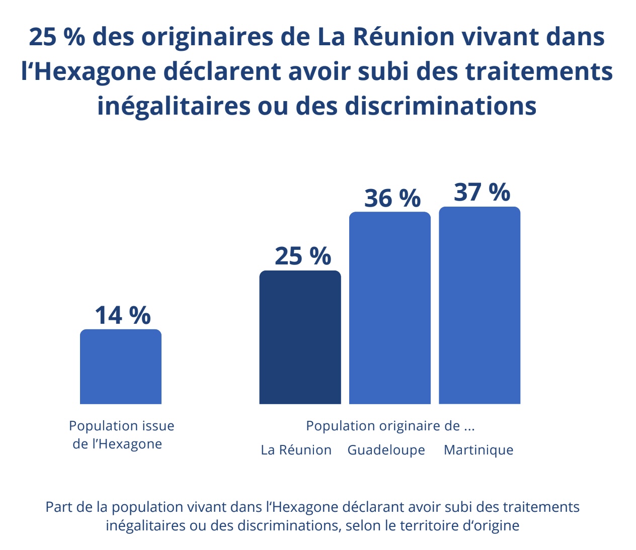 "Cette part est bien plus élevée que parmi les personnes nées dans l’Hexagone dont les deux parents y sont aussi nés (14 %). Elle est en revanche nettement moindre que pour les personnes originaires des autres Outre-mer (34 %), en particulier ceux originaires de la Martinique (37 %) et de la Guadeloupe (36 %)" détaillent les statisticiens