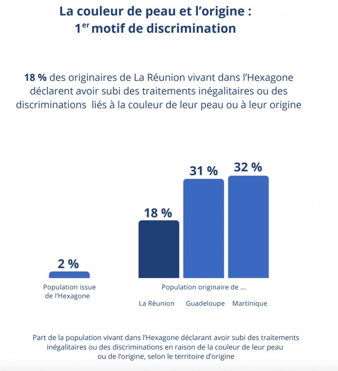 Les principaux motifs de discriminations pour les personnes originaires de La Réunion sont la couleur de peau et l’origine.