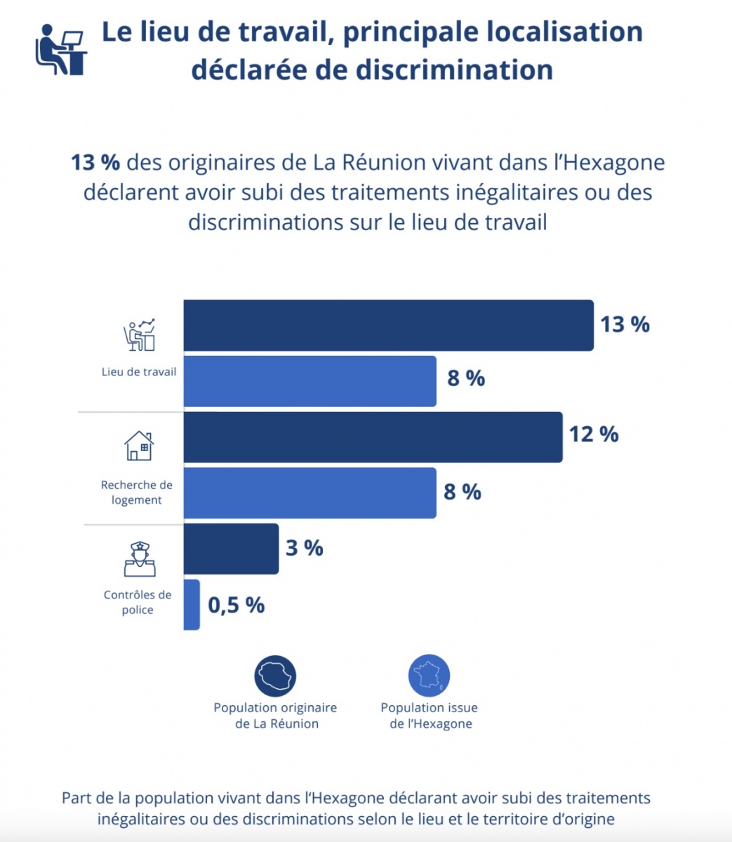 Pour les personnes originaires de La Réunion, tout comme pour la population issue de l’Hexagone, le lieu de travail est la principale localisation déclarée de discrimination.