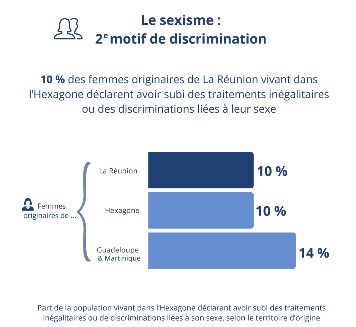 Après la couleur de peau et l’origine, le motif sexiste est celui qui est le plus mis en avant. Parmi les personnes originaires de La Réunion, 5 % déclarent avoir subi des discriminations à cause de leur sexe.