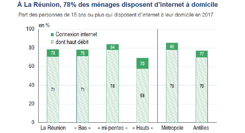 Malgré l’étendue des réseaux sur l’île et un niveau d’équipement qui rattrape progressivement celui de la métropole, 23 % des Réunionnais déclarent ne s’être jamais connectés à internet, contre 16 % des métropolitains. Si les plus jeunes ne sont pas ou peu concernés, 28 % des 45-59 ans et 64 % des seniors ne se sont jamais connectés.