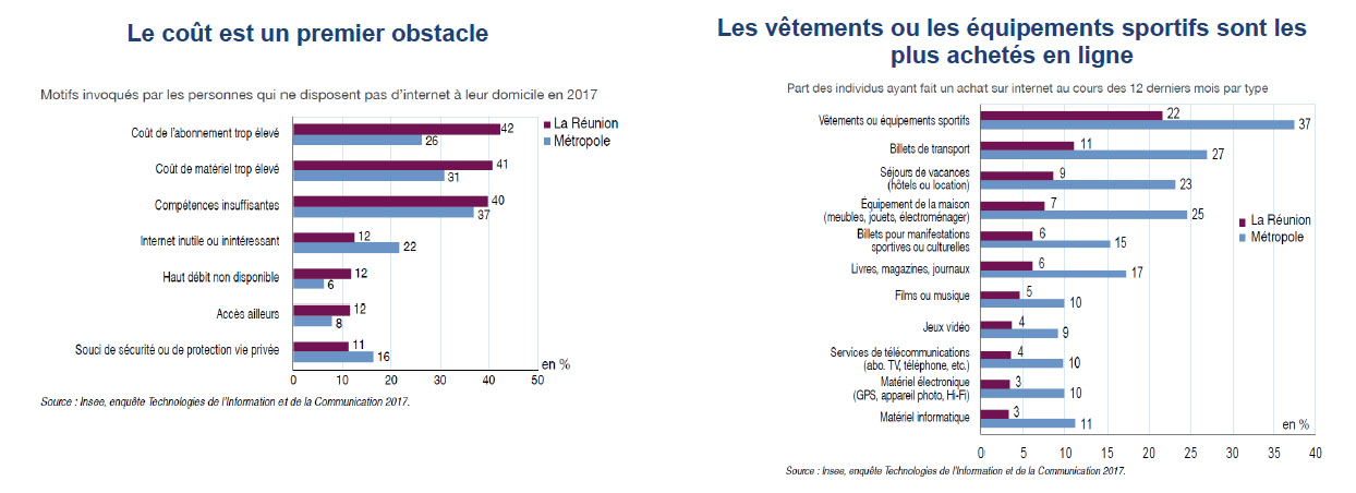 À La Réunion, 35 % des personnes ont fait un achat sur internet au cours des douze derniers mois. Cette part est nettement plus faible qu’en métropole (61 %), mais comparable à celle des Antilles. L’étroitesse de l’offre locale, la possibilité de livraison fréquemment inexistante vers les DOM ou les difficultés liées au transport ou aux taxes douanières peuvent expliquer cet écart.