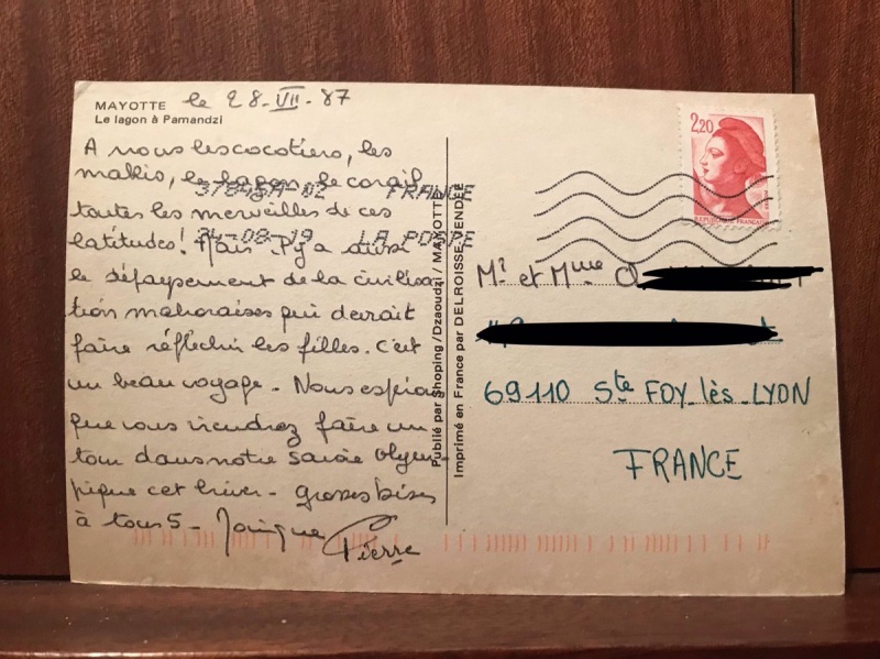 C'est une belle histoire que racontent nos confrères métropolitains de la radio RCF Lyon. L'une des journalistes de la rédaction a trouvé une carte postale à l'aspect ancien, posée sur la boîte aux lettres de sa résidence. Surprise : la missive date... de 1987. Pourtant le tampon de La Poste indique bien "24 août 2019". La carte postale, elle, a été envoyée de Mayotte. Mais les destinataires de la missive ne vivent plus ici, elle se met alors en quête de les retrouver avec l'aide d'une collègue.