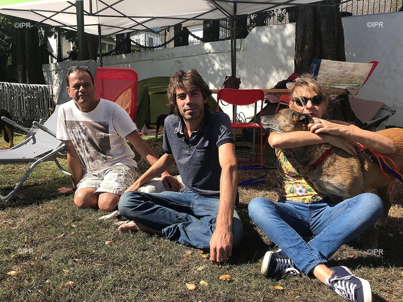 Devant la préfecture : un campement avec tente et banderoles sur lesquelles on peut lire : "stériliser c'est entraver l'errance animale", "exécutions = non", "arrêtez de fermer les yeux, 8.000 chiens euthanasiés chaque année à cause de l'incompétence de nos élus". Le président de l'association est venu avec ses 9 chiens, "en partie à moi ou en famille d'accueil" afin de pouvoir garder un oeil sur eux. "Ça illustre bien aussi notre propos, même si ces chiens-là ne sont plus malheureux."