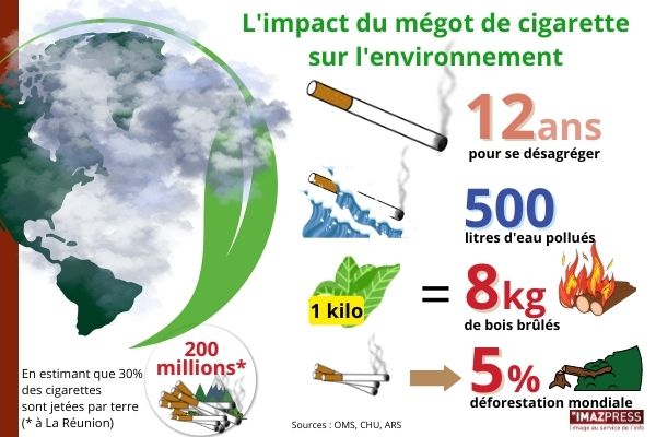 Selon l'ARS, "plus de 200 millions de cigarettes [sont] éparpillées chaque année dans les rues, les parcs, les plages et l’océan à La Réunion" si l'on prend en compte que 30% des cigarettes sont jetées par terre, et les 660 millions de cigarettes mises en vente en 2020 selon les derniers chiffres fournis par l'ORS Réunion (observatoire régional de santé).