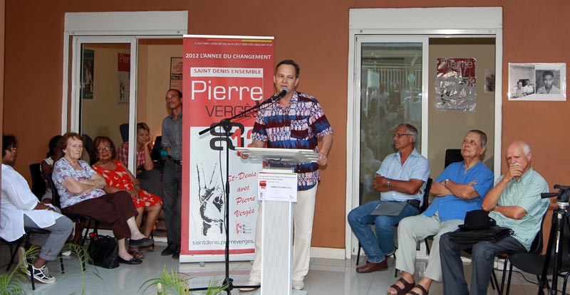 Pierre Vergès est le candidat du PCR pour les législatives dans la première circonscription (Saint-Denis). Ce samedi 3 mars 2012 il a inauguré sa permanence de campagne située 153 rue Sainte-Marie à Saint-Denis. Paul Vergés et Élie Hoarau, respectivement président et secrétaire général du parti communiste, ont notamment assisté à l'inauguration.